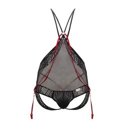 Body Candyman 99585. Un body ultra sexy en maille transparente et détails en dentelle sur le devant et le dos. Couverture minimale. Collants non inclus. 94% Nylon, 6% Elasthanne.