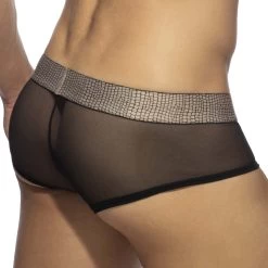 Boxer Addicted Snake Net AD1016. Boxer trÚs confortable et trÚs sexy. Vous allez adorer sa poche frontale non doublée. Ceinture imprimée avec un effet serpent doré et logo en silicone AD au milieu de la ceinture. Tissu extensible C-through trÚs confortable. 93% Polyester, 7% Elasthanne.
