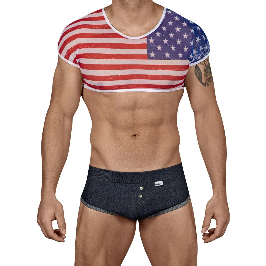 Costume American Crop-Top Candyman 99443. Ce costume est composĂ© d’un crop-top aux couleurs de l’amĂ©rique et un boxer en simili jean. Cet ensemble pourra pimenter votre jeu de sĂ©duction.94% Nylon, 6% Elasthanne