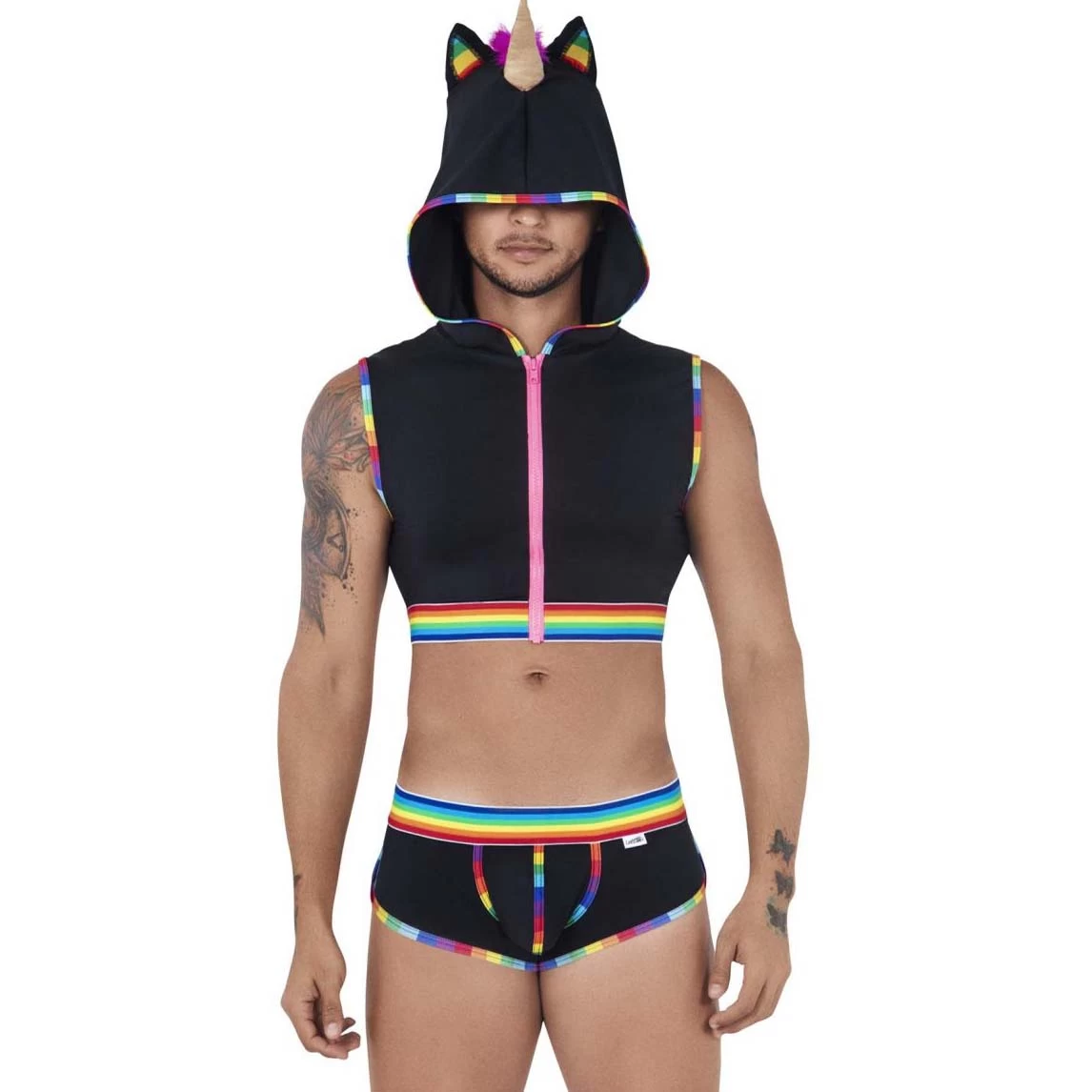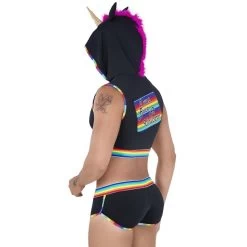 Ensemble Candyman 99520. Ensemble slip et haut. Sweat à capuche court et des détails amusants de licorne, fermeture éclair sur le devant, imprimé dans le dos. Slip Taille basse, poche cousue pour plus de maintien, bordures de couleur contrastée. 78% Polyester, 22% Elasthanne.