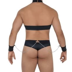 Ensemble Candyman 99592. Ensemble de deux piĂšces qui comprend une large sangle et un harnais tour de cou avec un string sexy avec des manchettes et des chaĂźnes. 88% Polyamide, 12% Elasthanne.