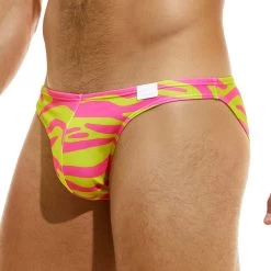 Slip de bain Modus Vivendi Tiger DS2312. Slip de bain minimaliste, taille basse. Imprimé tiger. Il offre une couverture minimale, Logo de la marque au niveau de la ceinture. Sechage rapide grùce à son mélange de matiÚres. 80% Polyester, 20% Elasthanne.