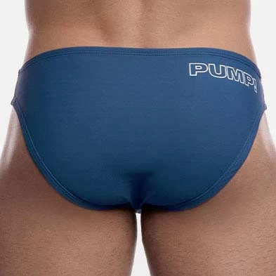 Slip de Bain Pump! Blue Water Cheeky 13012. Slip de bain en microfibre avec un séchage rapide. Tissu résistant aux UV (UPF 50+). Ceinture élastique. Logo de la marque sur la fesse droite. 64% Nylon, 36% Elasthanne.
