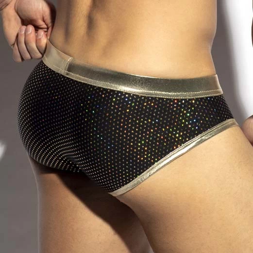 Slip ES Collection Party UN586. Découvrez ce Slip exceptionnel au tissu extra fin extensible Film métallique brillant laminé en argent partout. Poche frontale généreuse qui vous assure un excellent maintien. Ceinture élastique avec le logo au nom de la marque. Taille basse. 80% Polyamide, 20% Elasthanne.
