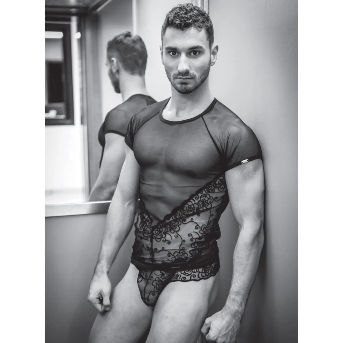 T-Shirt Eros Veneziani 7470. Sublimes motifs dentelle sur le bas du T-Shirt en tissu semi transparent trÚs sexy. MatiÚre trÚs agréable à porter. T-shirt col rond. 85% Polyamide, 15% Elasthanne.